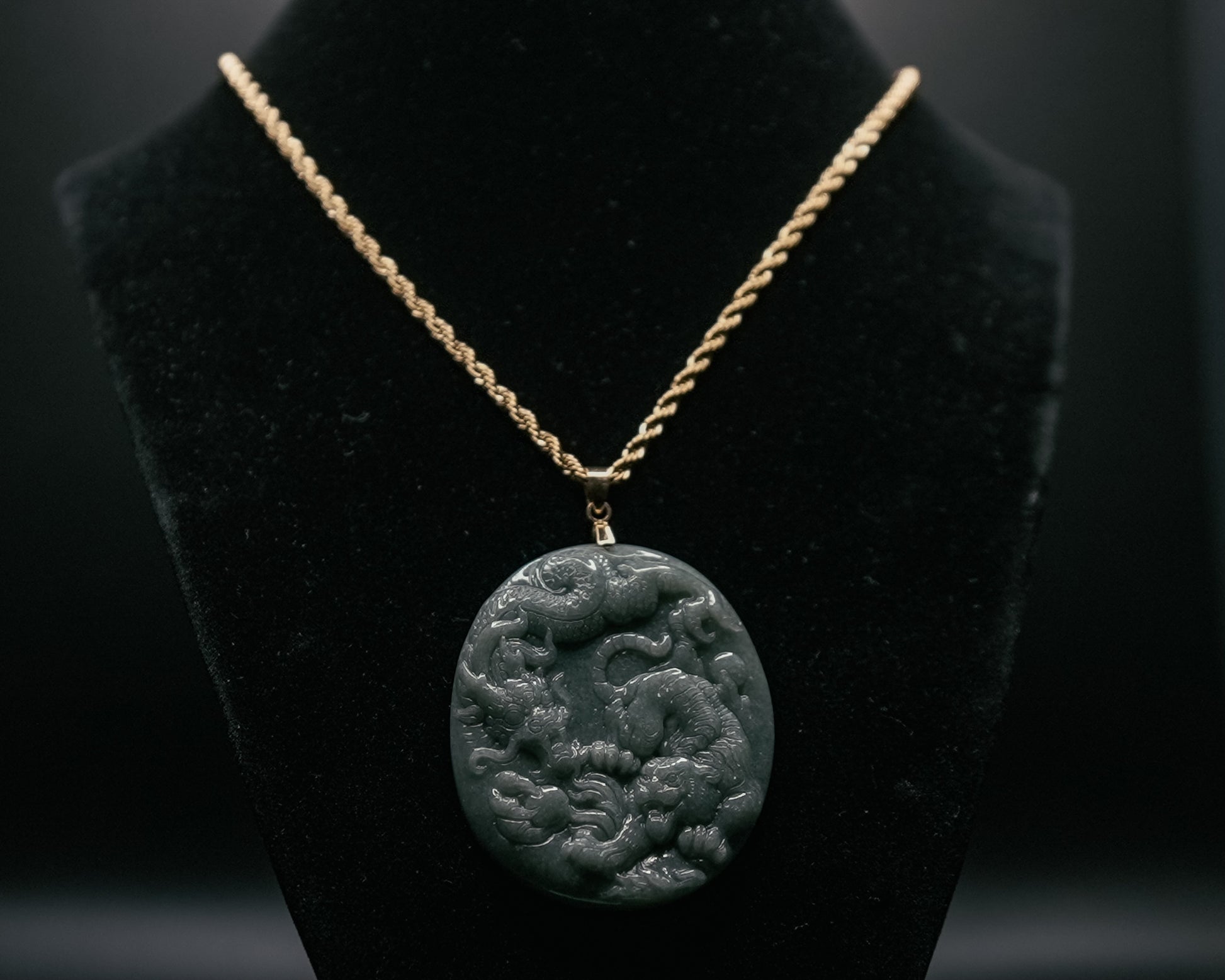 Material: Genuine Grade A Jadeite, complemented by a standard 20-inch or 22-inch 18k gold plated rope chain and a solid 10k gold bail.
