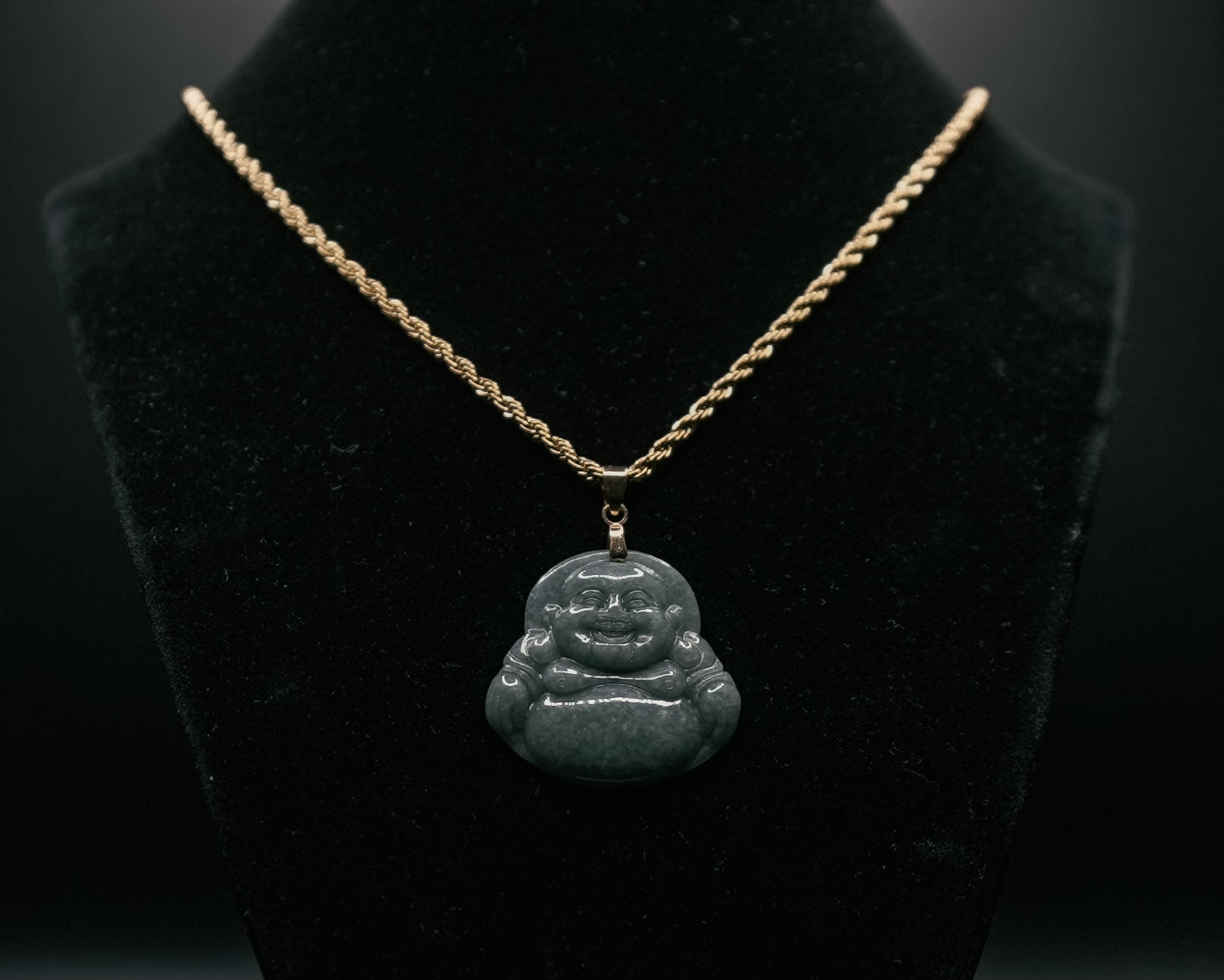 Material:Genuine Grade A Jadeite, complemented by a standard 18-inch, 20-inch or 22-inch 18k gold plated rope chain and a solid 10k gold bail.